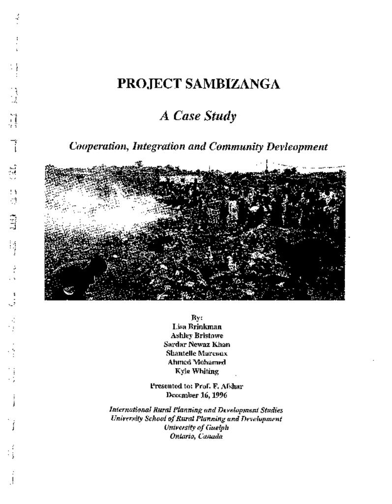 Case study presented by students of the International Rural Planning and Development Studies, University School of Rural Planning and Development, University of Guelph, Ontario Canada. This case study analyses Project Sambizanga's ability to meet its objectives by identifying and critiquing planning and implementing methods as well as the project components': water sanitation and waste management; community development; training and health.