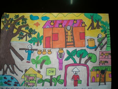 DWFVIE040045a School children drawing on preventing typhoon damage to houses1