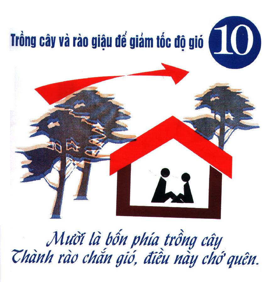 Poster with ten key principles of storm resistant construction - Plant trees around the house as wind breaks and to reduce pressure of water; but not too close